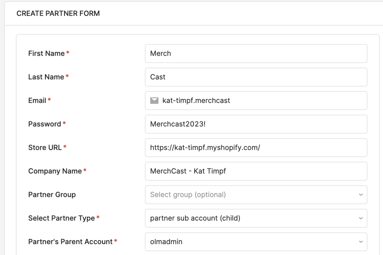 Note: Creating the account does not automatically connect the Shopify store; it just prepopulates the URL provided. Partner still has to log in to it the regular way in the Hub.
